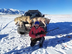 Мергенчи К.Чомаев эки эң чоң карышкырды атып өлтүрдү. Сүрөт